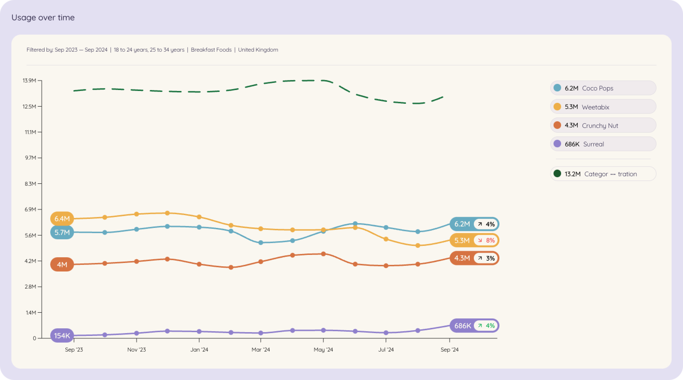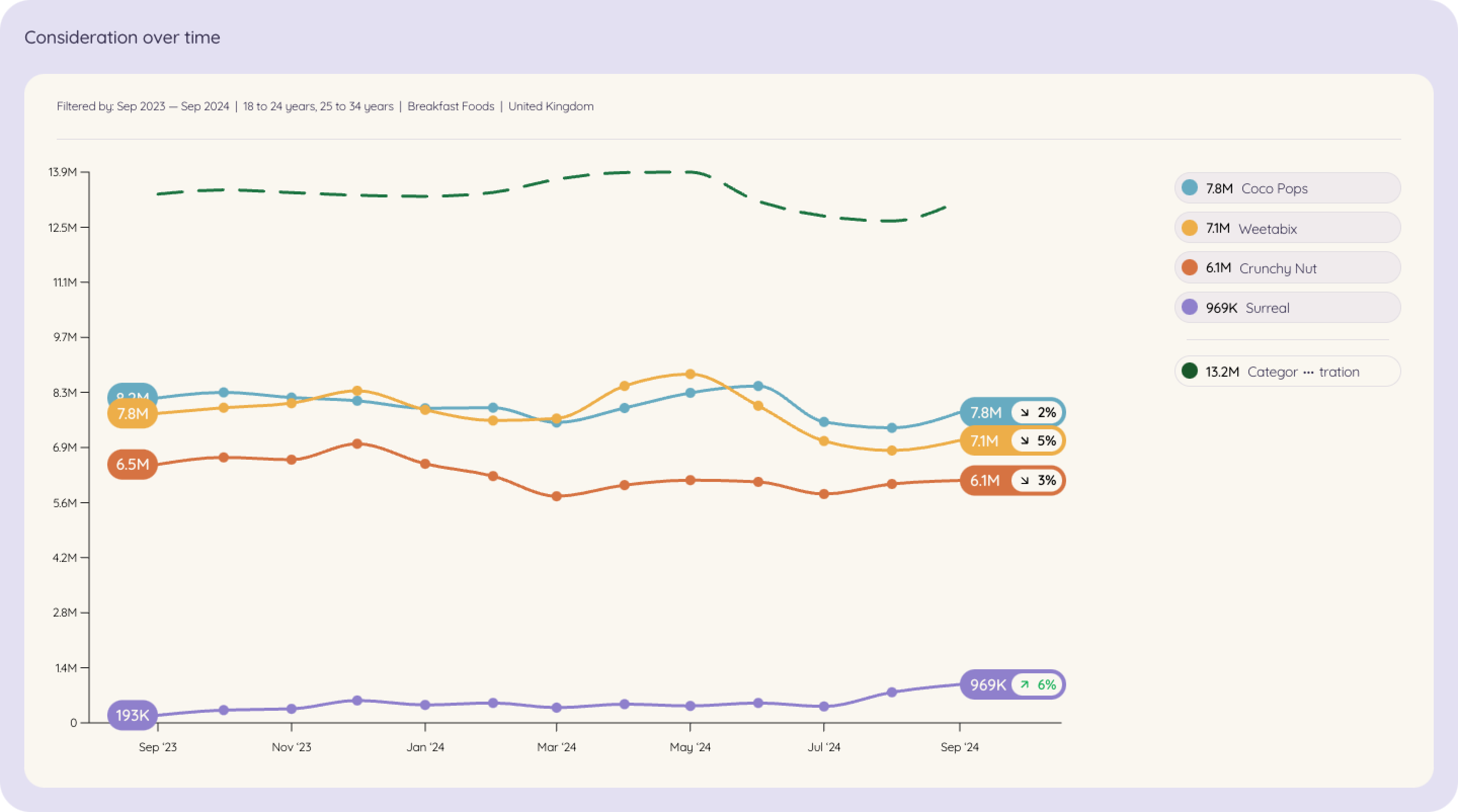 Incumbents like Quaker, Special K, and Weetabix still have the lion's share of brand awareness, Surreal's growth trajectory is a lot higher, suggesting its campaigns are reaching new audiences and capturing attention.