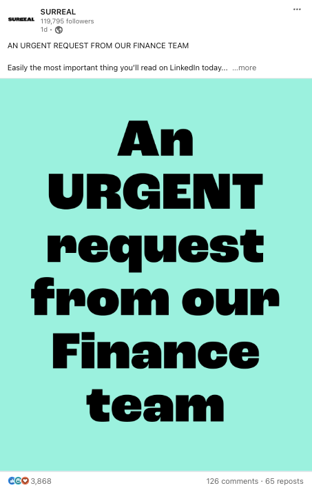 What's interesting about the company's LinkedIn approach is that it doesn't tone down its brand voice, even when speaking to a more "professional" audience. Surreal is known for its funny and bold marketing—and while this style is more common on platforms like Instagram, the brand brings the same energy to LinkedIn.
