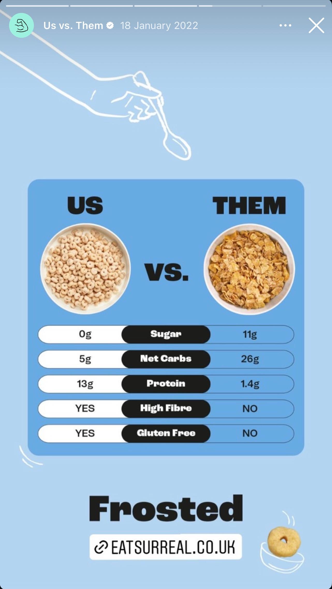 On Instagram, Surreal has a whole highlight reel comparing its cereal with traditional brands. These assets are an easy-to-grasp, no-nonsense way to prove Surreal isn't just a different brand of cereal—it's better.