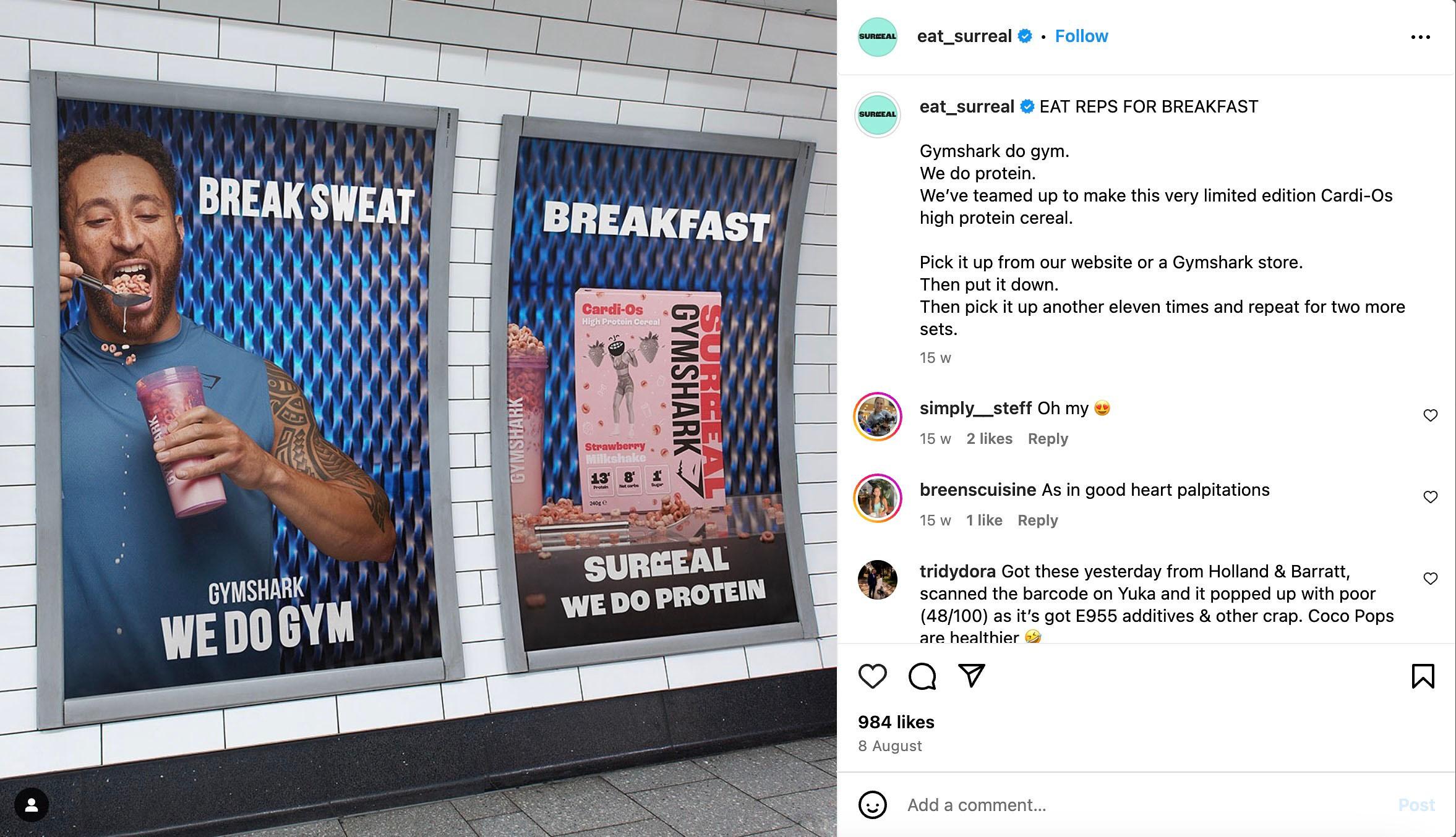 Fact: gym rats are obsessed with protein. That's why it makes total sense for Surreal, a high-protein cereal brand, to jump into the fitness world. And who better to partner with than fellow UK brand Gymshark? Earlier this year, Surreal teamed up with the popular athletic brand to launch Cardi-Os, opens in new tab, a high-protein cereal perfect for post-workout munchies or pre-gym fuel.