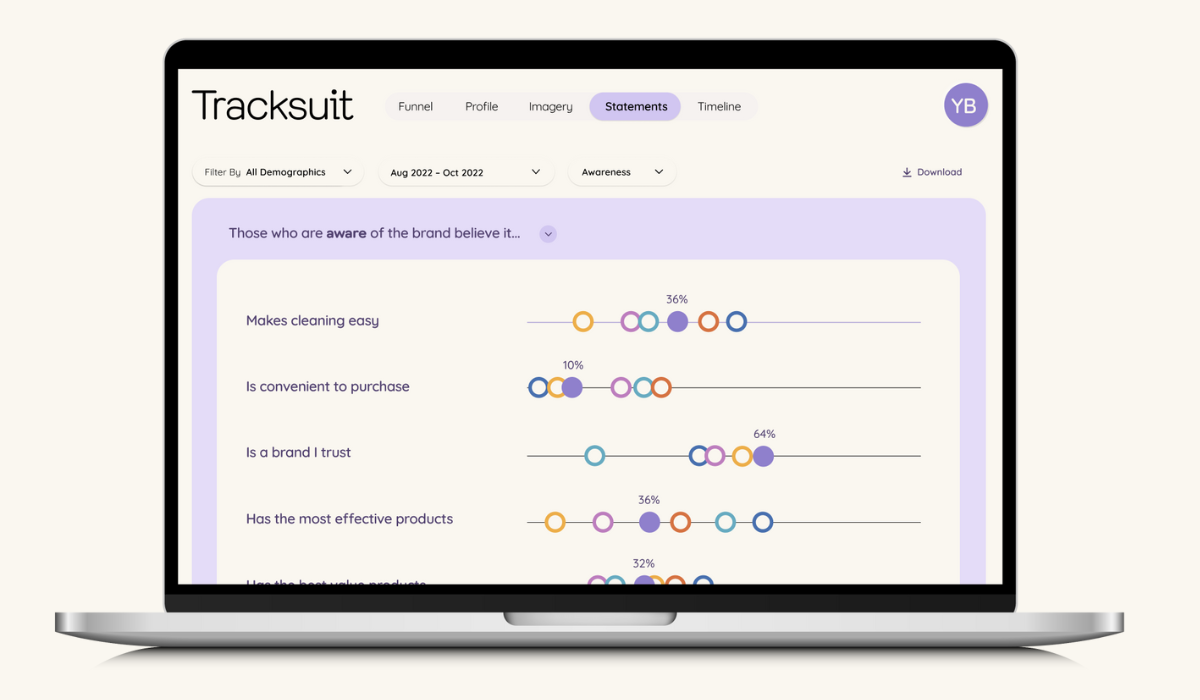 So, how do you track whether your purpose is being received loud and clear by consumers and resonating more and more over time? Tracksuit’s Statements feature lets you write five statements related to your business’s key value proposition and what you want to be known for. We survey consumers in your category about your company and five competitor brands to see how much people agree with each statement on a scale of 0-100%.