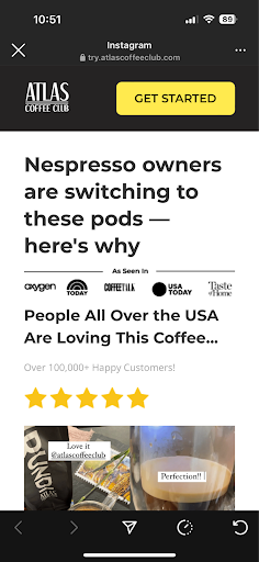 Both of these ads do a good job at demonstrating the advantages of subscribing to Atlas Coffee Club over other coffee options. They emphasize Atlas' value propositions — including variety, convenience, and personalization. Clicking through these ads takes you to a page sprinkled with social proof, to give shoppers even more confidence in their purchase.
