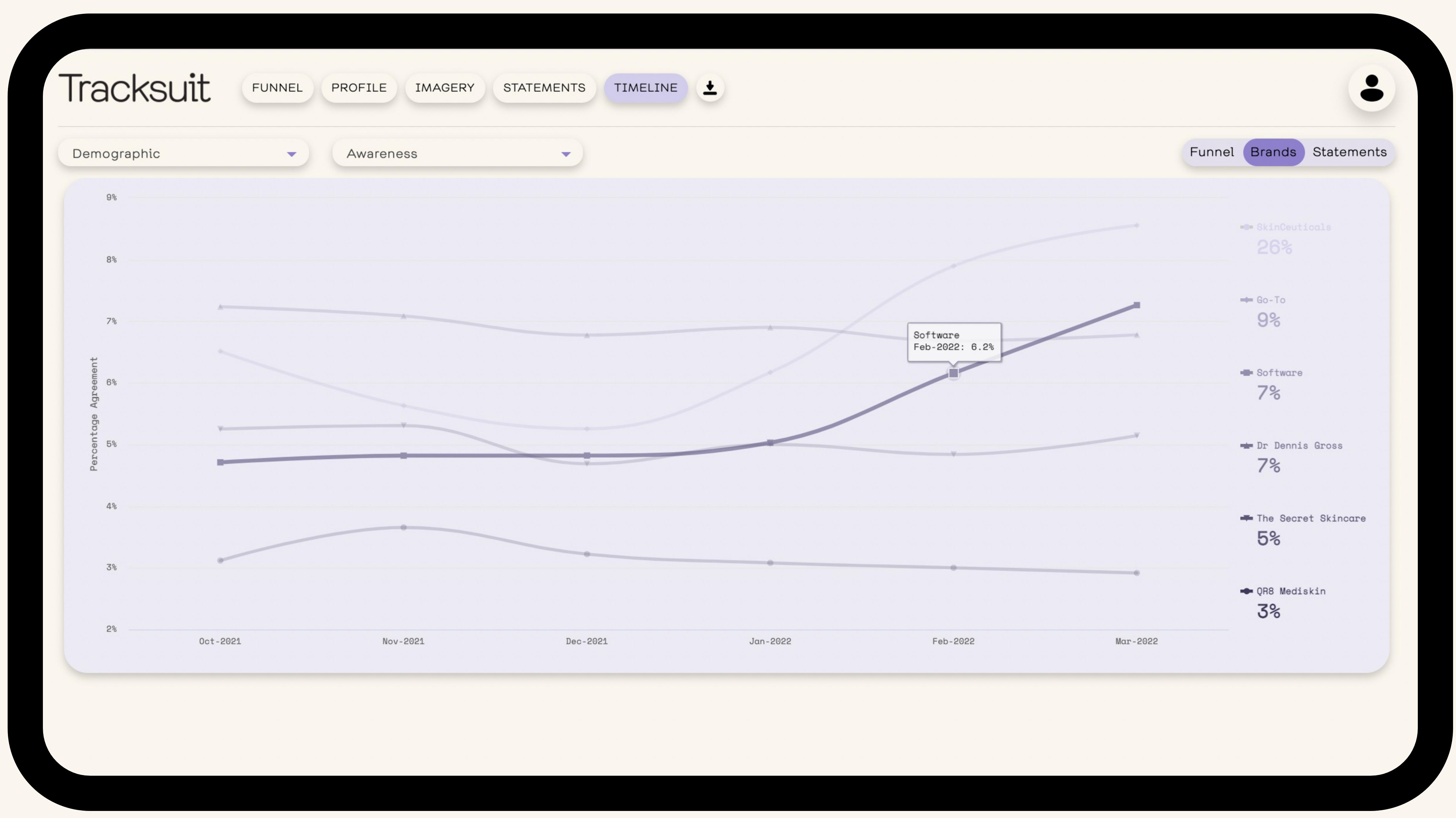 “I believe early-stage brands should be looking to drive some sort of action with all layers of their marketing. So [before Tracksuit] we would mostly look for behavioral results like site traffic, consults and orders as a result of brand activity.”