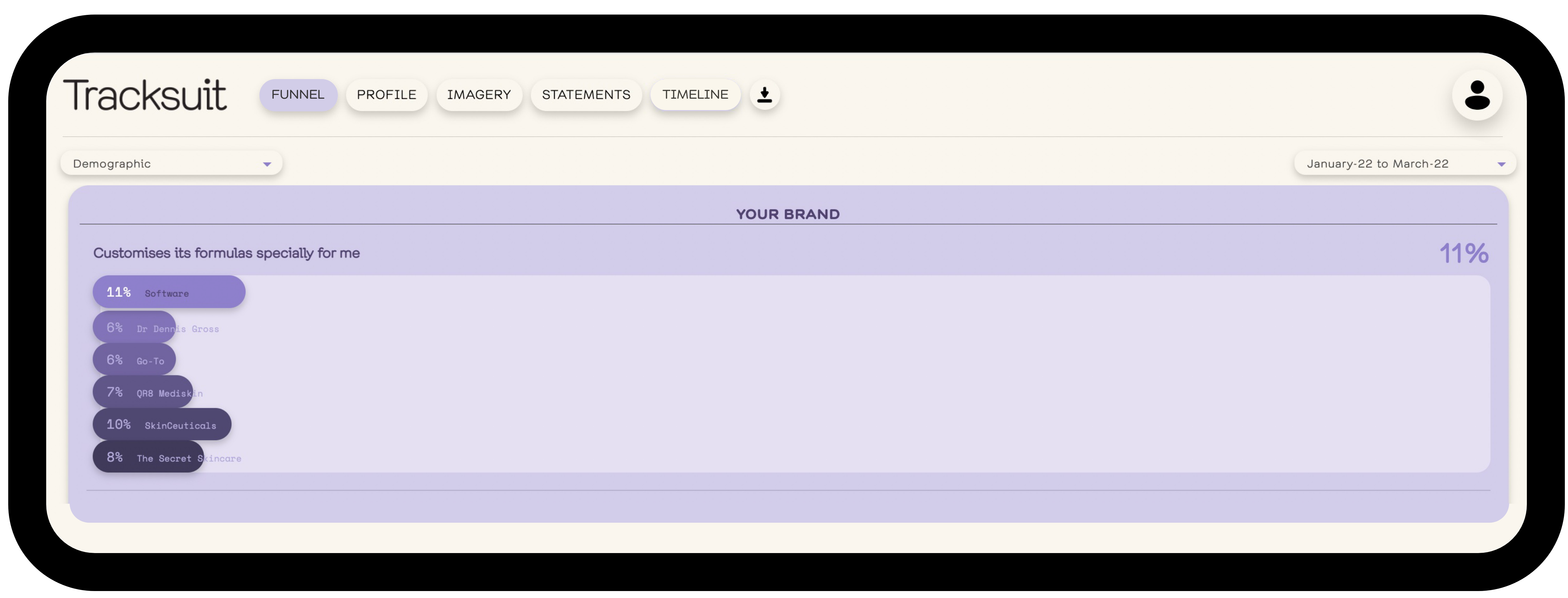 The data tells us, 11% of respondents in the skincare market agree that Software customizes its formulas specifically for them. In a highly competitive market, winning on key value propositions (like this one) is an excellent measure of strong brand health.