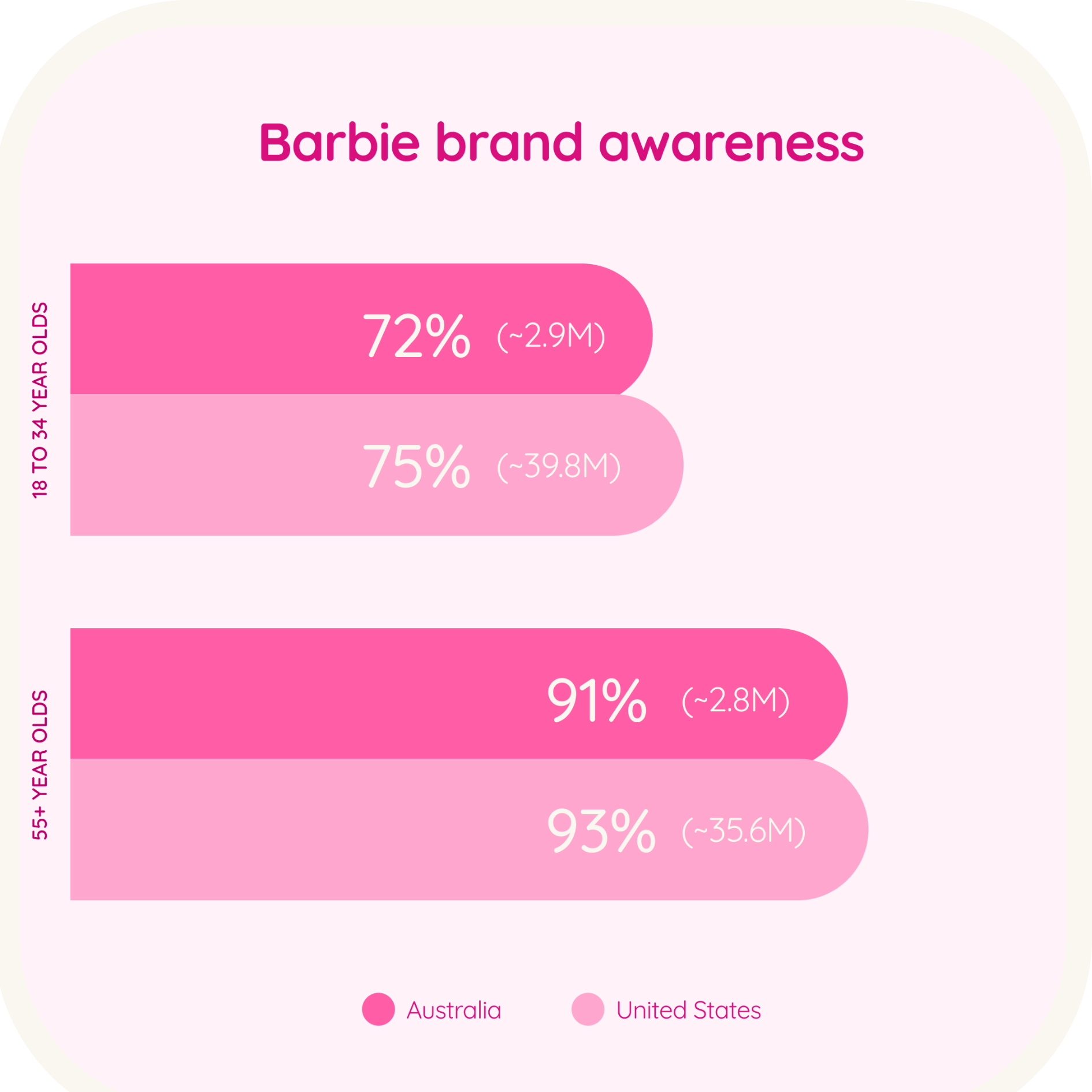 But demographic disparities also show the challenges the Barbie brand is up against. Barbie’s brand awareness is strongest in older generations aged 55 and over in Australia, likely due to the brand’s legacy having less resonance with younger consumers. A similar result can be seen in the United States.