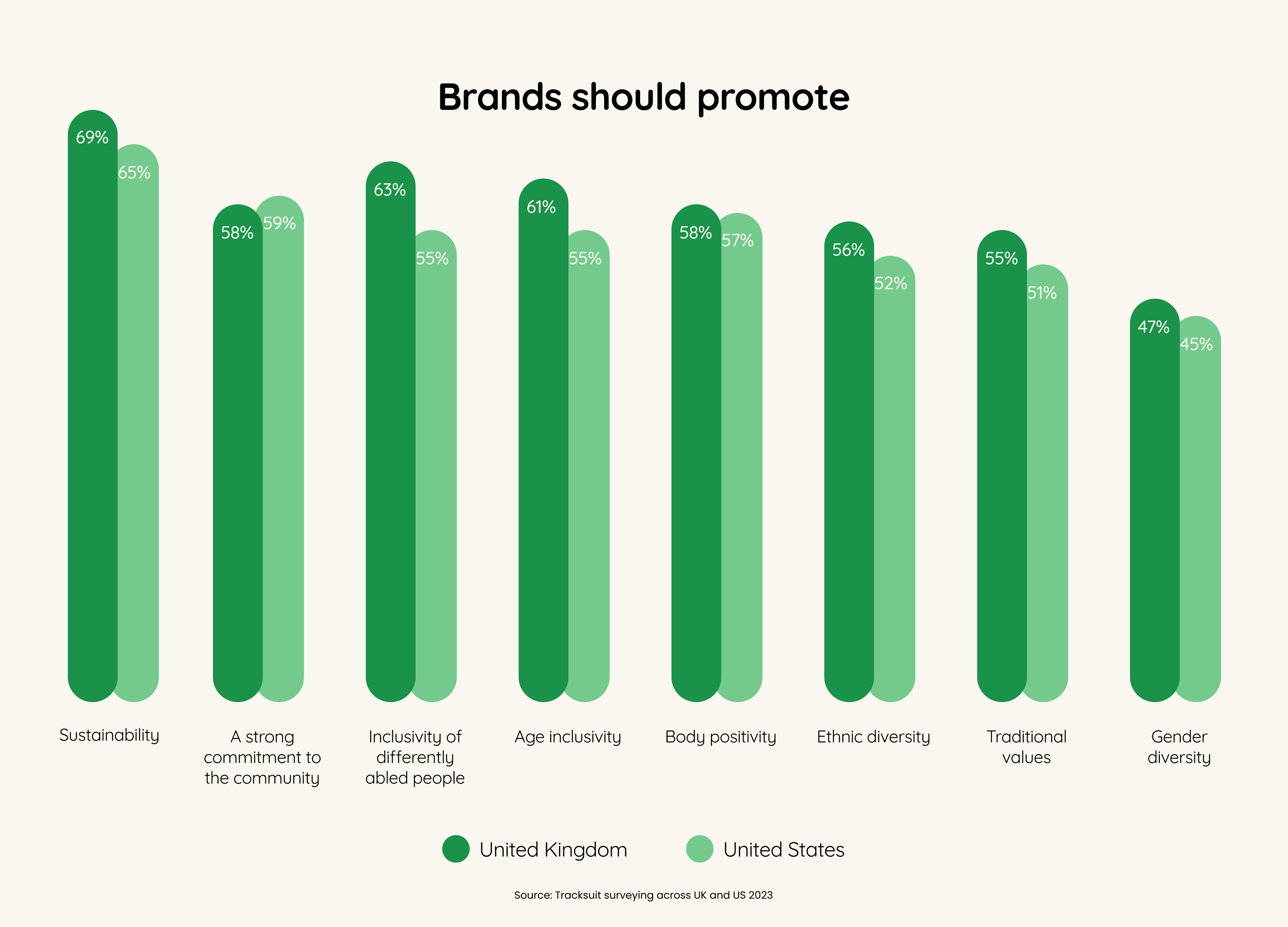 The top attributes consumers think brands should promote across all four markets are sustainability, a strong commitment to the community and inclusivity of differently abled people.