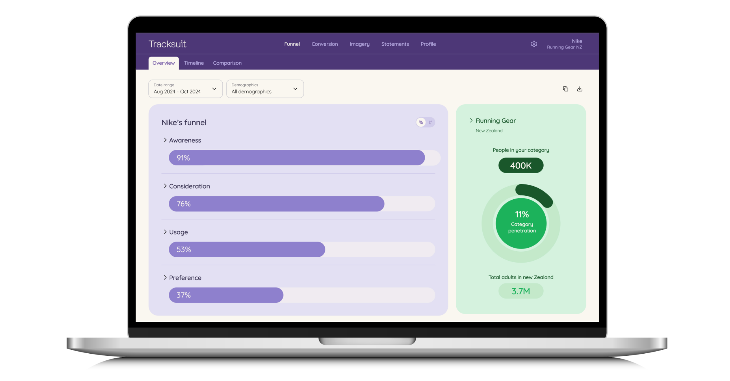 Say goodbye to bulky, unread reports that gather dust on your desk and say hello to the convenience of the Tracksuit dashboard. You can login whenever you want to see your brand metrics, and how they’re changing over time.