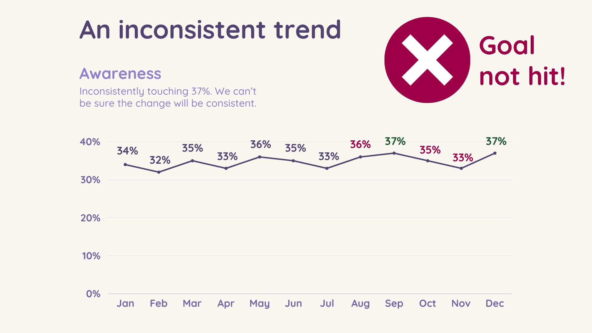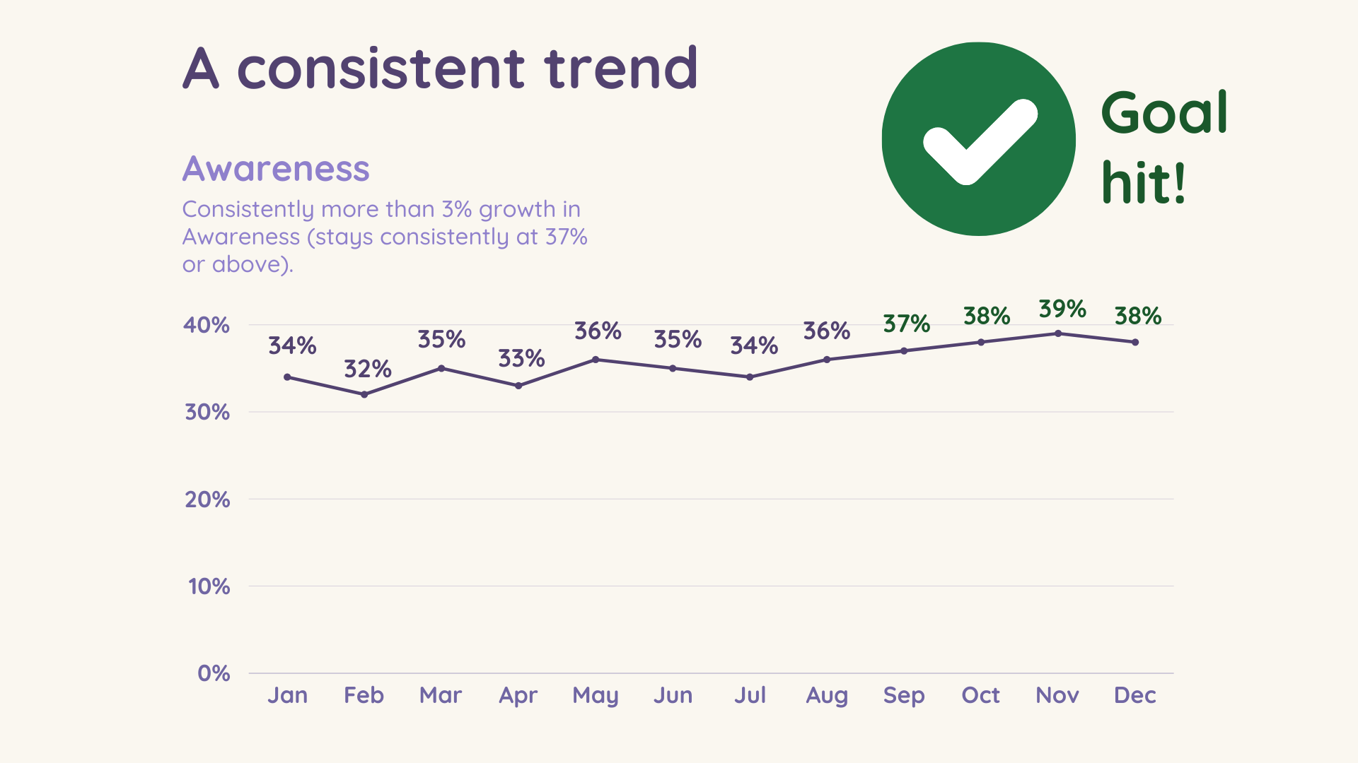 If you have increased your awareness by 3% over the past year (the average growth across 12 months), and can identify a consistent trend at this higher level of awareness, then you can be confident you’ve hit your goal.