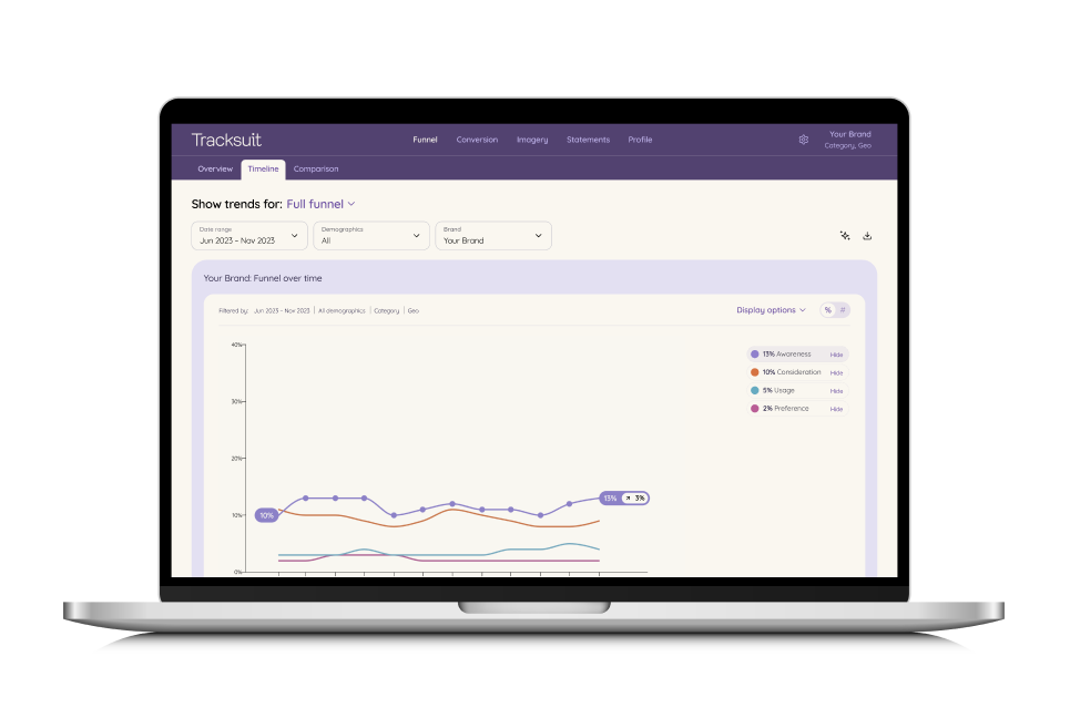 To pair benchmarks with your actual performance, you can track the shifts in your brand metrics on the Tracksuit dashboard. The Timeline view will be your go-to, providing clear oversight on how your awareness, consideration, usage and preference are evolving over time. When the time comes to compare your brand’s growth against benchmarks, the data is right there for you to see!