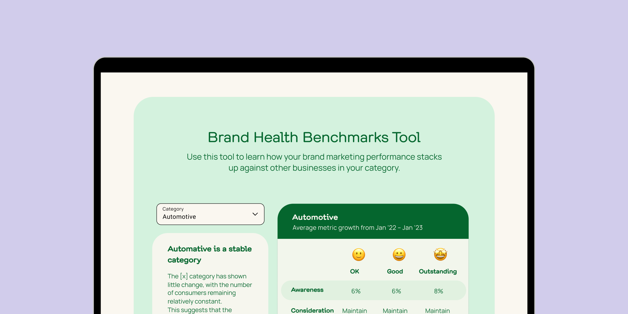 Benchmarks mean you can say goodbye to guesswork about what level of brand growth is considered good for your category. Use them to set your own goals for the year ahead, as well as to set realistic expectations for the rest of your team.