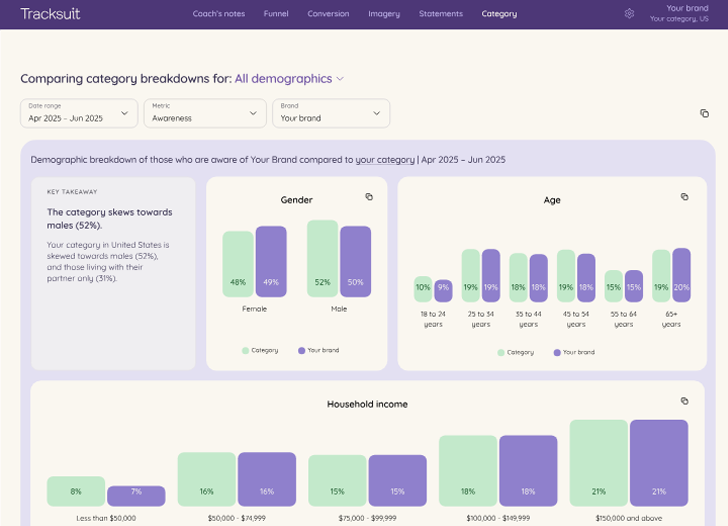 If you want to understand how your brand truly stacks up against competitors in consumers' minds, that requires a different kind of intelligence. Tracksuit gives marketing teams always-on access to awareness, consideration, and preference data, benchmarked against competitors and updated monthly.