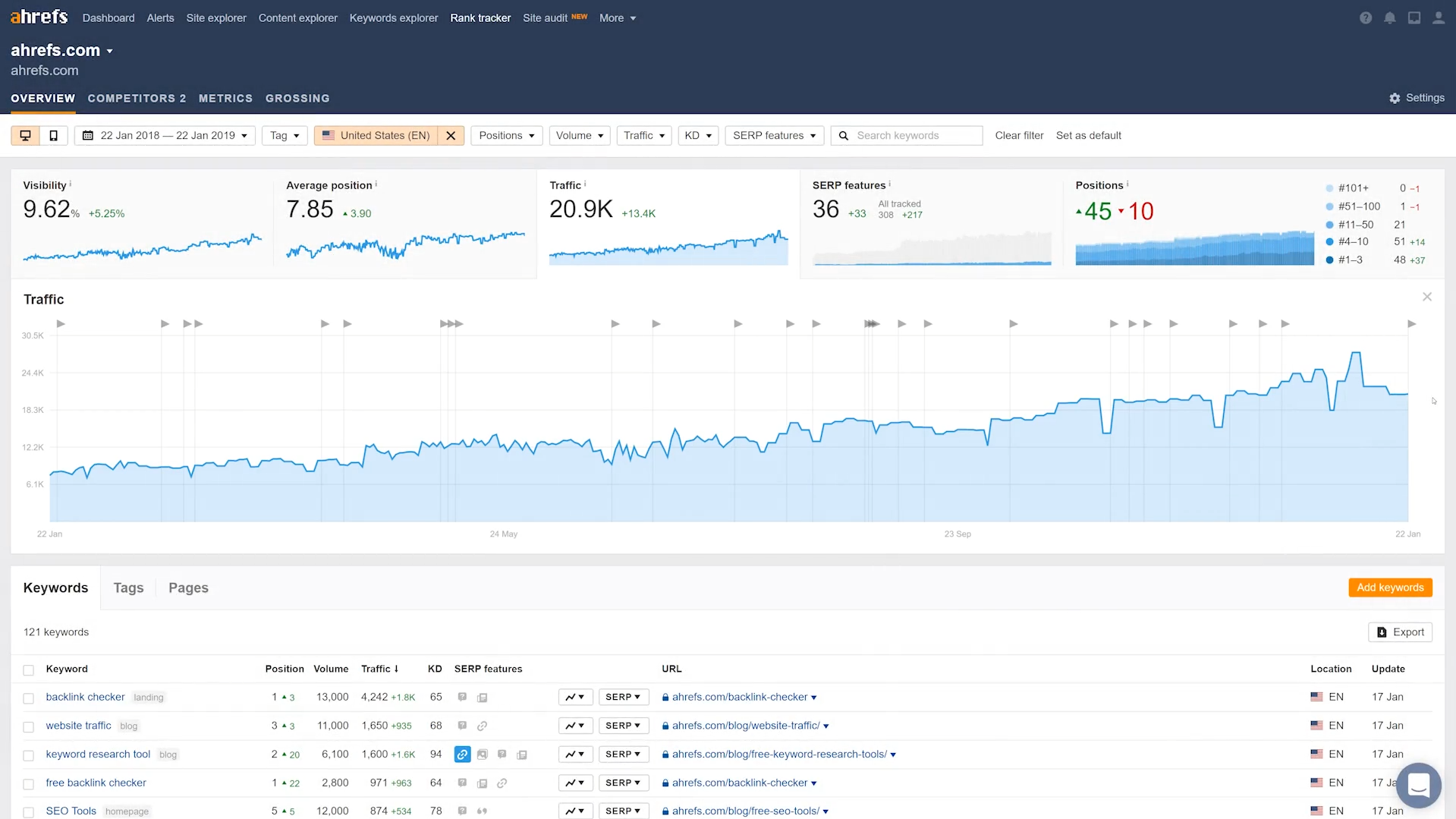 • Site Explorer: Provides a detailed view into any domain's organic traffic, top-ranking pages, keyword positions, and backlink profile