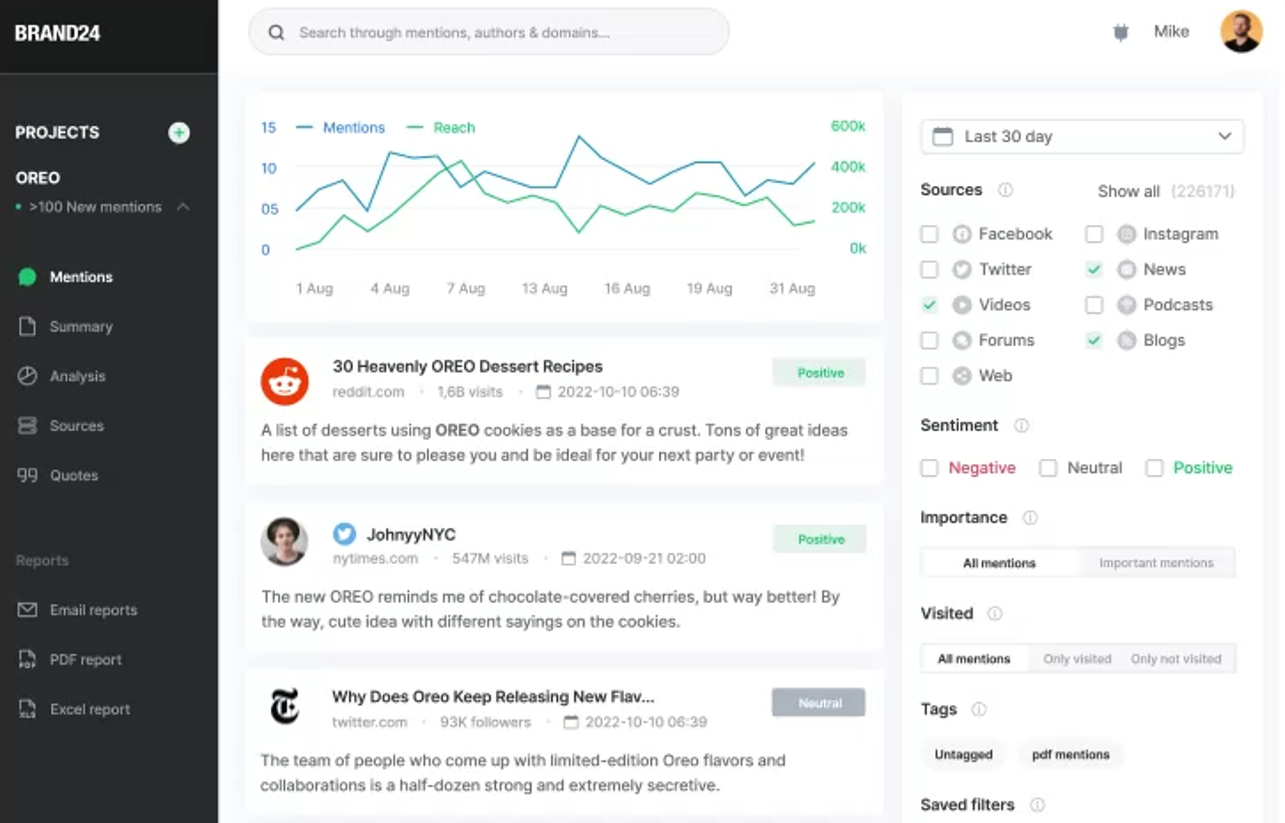 This is different from brand tracking. Social mentions capture the vocal minority, while survey-based tools like Tracksuit measure what a representative sample of consumers actually think. Both are valuable, but they answer different questions. Brand24 is best for real-time awareness of competitor PR, reputation shifts, and emerging conversations.