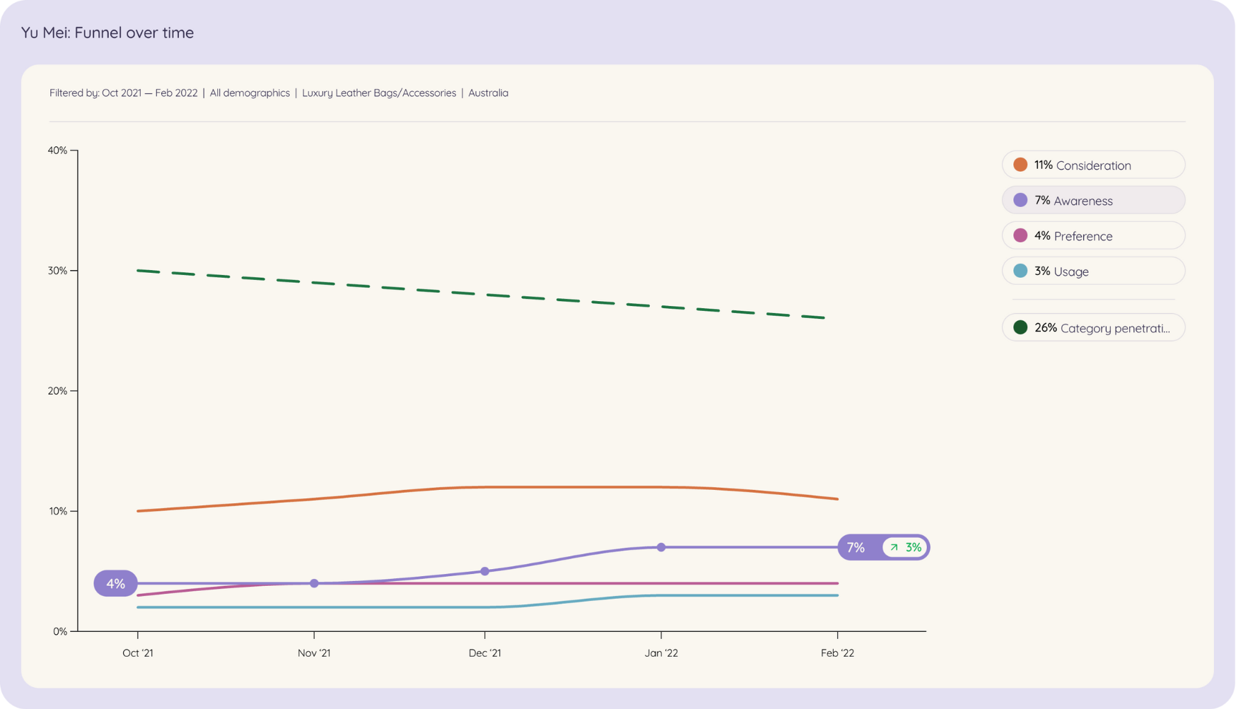 In the Yu Mei dashboard, shown above, we can see in the timeline tab that Yu Mei has been able to build future demand, while simultaneously capturing existing demand. This awareness trend line (in purple) tells the story of a brand which has been able to double its awareness in the last quarter, from 3.7% to 7.1% – a feat no other brand in their competitor set achieved in 2021 – and in parallel, convert these people into customers (shown as the darkest line at the bottom of the dashboard).